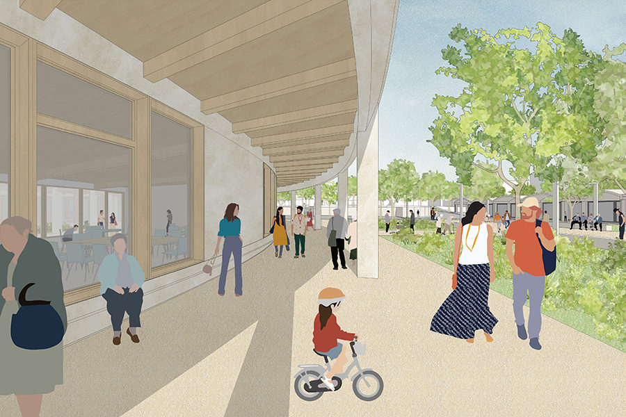 – au Sud, intégrant la placette des Magnans et ses oliviers préservés, une vaste place végétalisée est créée : traitée en mail, elle permet l’accueil hebdomadaire d’un marché.