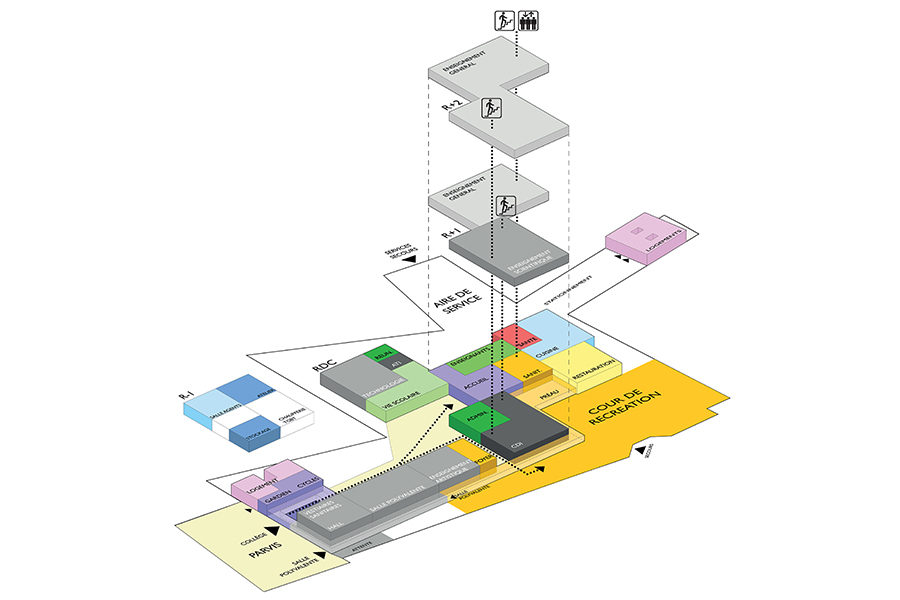 Son positionnement en interface parvis et cour délimite un lien physique protégé pour l’accueil des élèves.