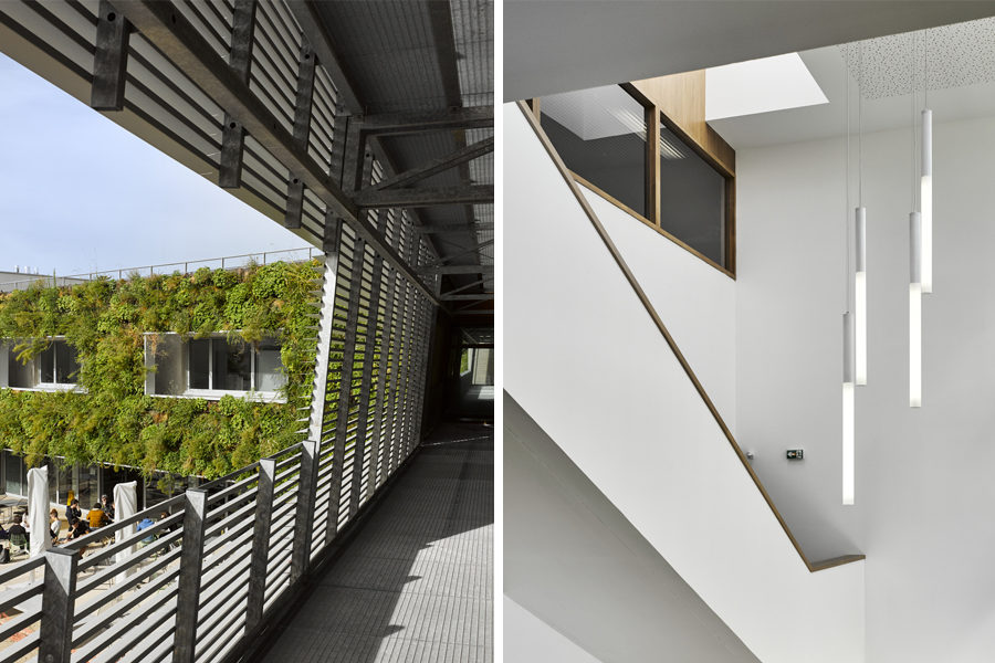 Double peau thermique avec bardage, canons à lumière et patios, mur végétal, toiture plantée.
