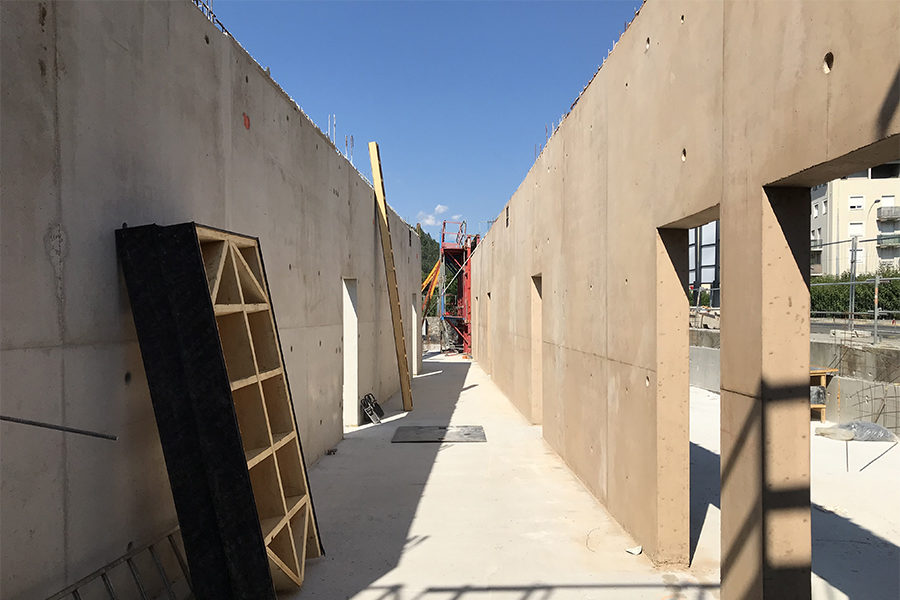 Les bétons matricés et lisses teintés dans la masse du gymnase Maria Borrely sont coulés.